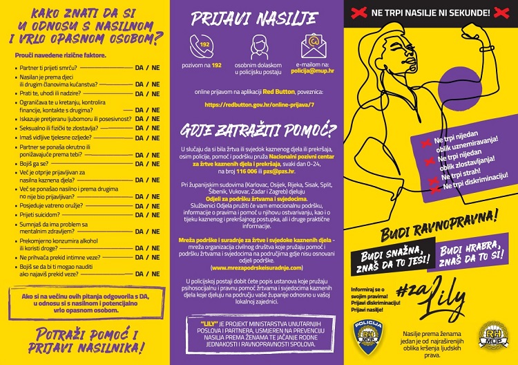 Ogromni napori ulažu se u prevenciju i senzibilizaciju javnosti te ciljanih društvenih skupina, a koju postižemo kroz kontinuiran i sustavan rad te provedbu preventivnih projekata i programa te preventivnih kampanja kao što je kampanja “Lily”. Spomenuta kampanja usmjerena je na sprječavanje nasilja prema ženama i nasilja u obitelji, a dodatno kroz svoje komponente kampanja sadržava i aktivnosti namijenjene osobama muškog spola s ciljem njihove senzibilizacije na temu ravnopravnosti spolova kao i isključivanja svih oblika nasilnog ponašanja.