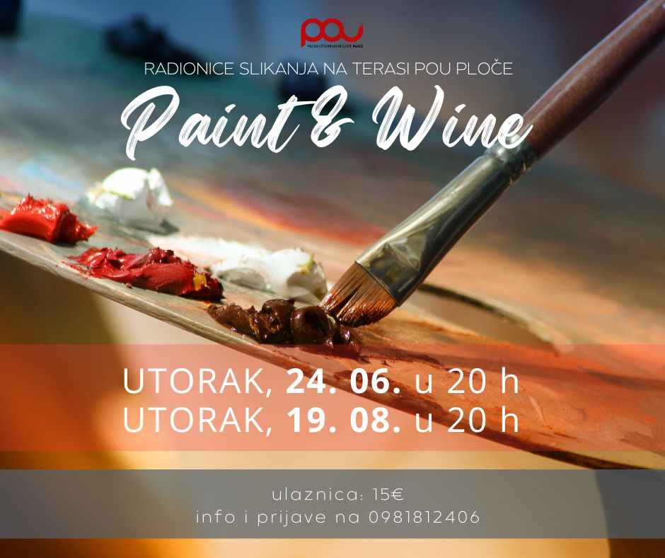 Rezervirajte svoje mjesto na radionici slikanja Paint and Wine i uživajte u večeri ispunjenoj bojama, smijehom i odličnim vinom. Tako su u ponudi 2 radionice – jedna u utorak 24. lipnja, druga utorak 19. kolovoza. Ulaznica za pojedinu radionicu je 15 eura. Prijavite se na vrijeme!