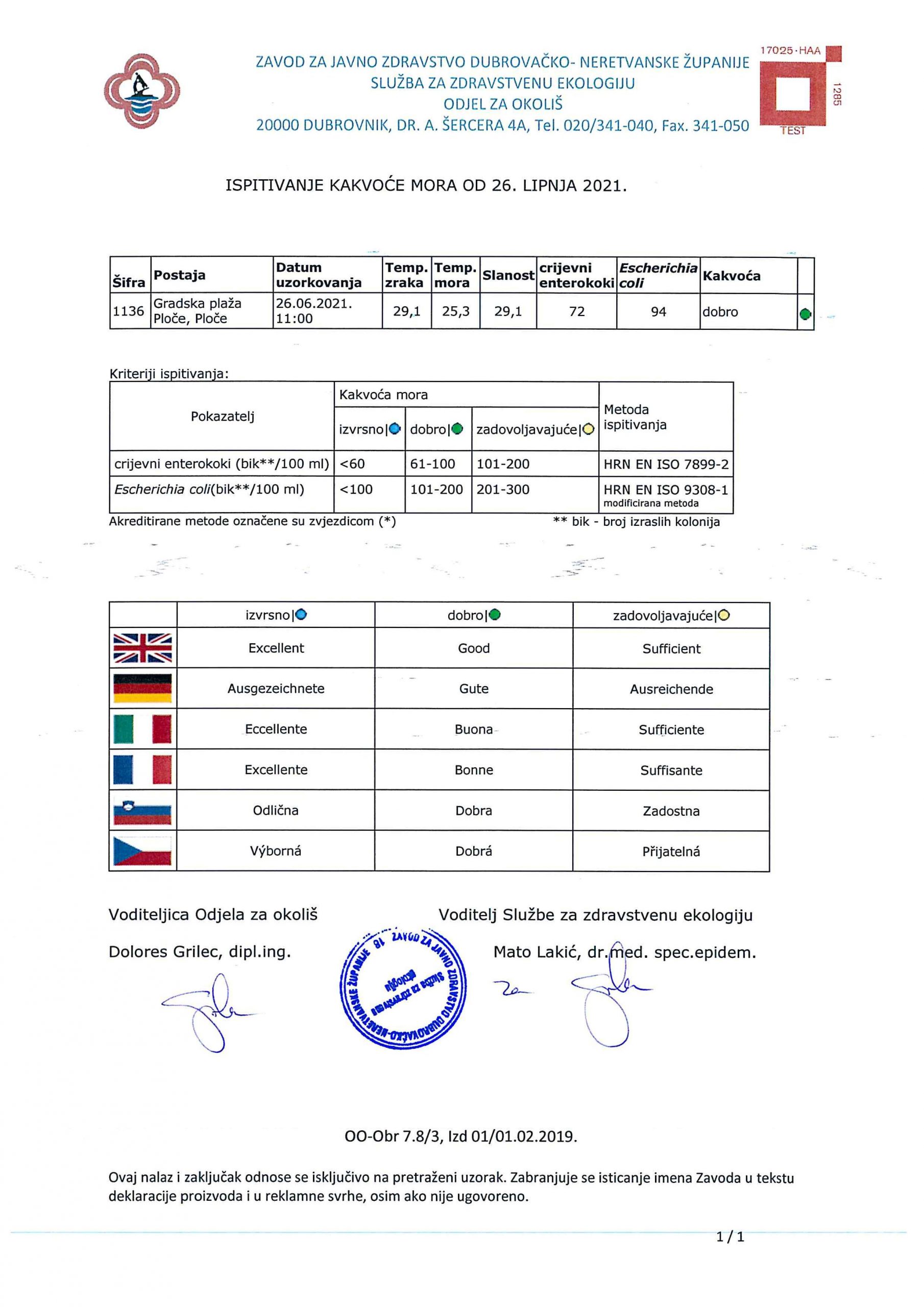 S obzirom na to da na Gradskoj plaži u Pločama postoji zabrana kupanja od 2006. te prema Uredbi ista nije u Programu ispitivanja kakvoće mora za 2021., Zavod za javno zdravstvo Dubrovačko-neretvanske županije je sukladno ugovornim obvezama s Dubrovačko-neretvanskom županijom obavio dodatno ispitivanje kakvoće mora na navedenoj plaži 26. lipnja 2021.