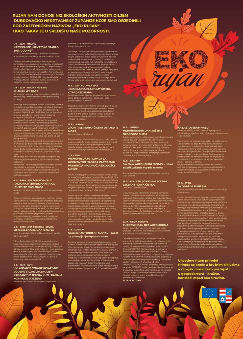 Rujan nam donosi niz ekoloških aktivnosti diljem Dubrovačko-neretvanske županije objedinjenih pod zajedničkim nazivom „Eko rujan“.