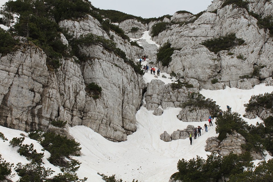 Popeli smo se na oko 1400 metara visine i nas dva botaničara, Duje i ja, primjećujemo da se pojavljuje sve više crnogorice i da su grane graba i bukve gole, nemaju listova. Staza je sve strmija i sve skliskija. Okruženi smo visokim stijenama od kojih se odlama kamenja i stvara sipar.