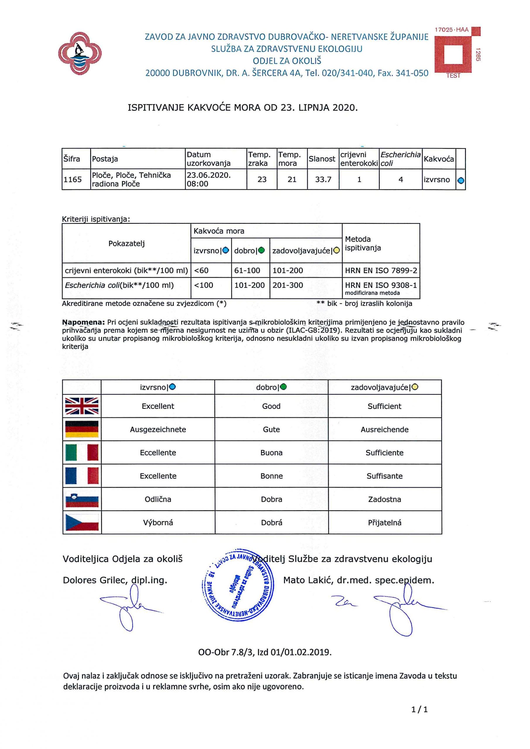Donosimo izvješće o kakvoći mora na plaži Tehnička radionica u Pločama od 23. lipnja 2020. godine u kojem stoji da je more na navedenoj lokaciji izvrsne kakvoće.