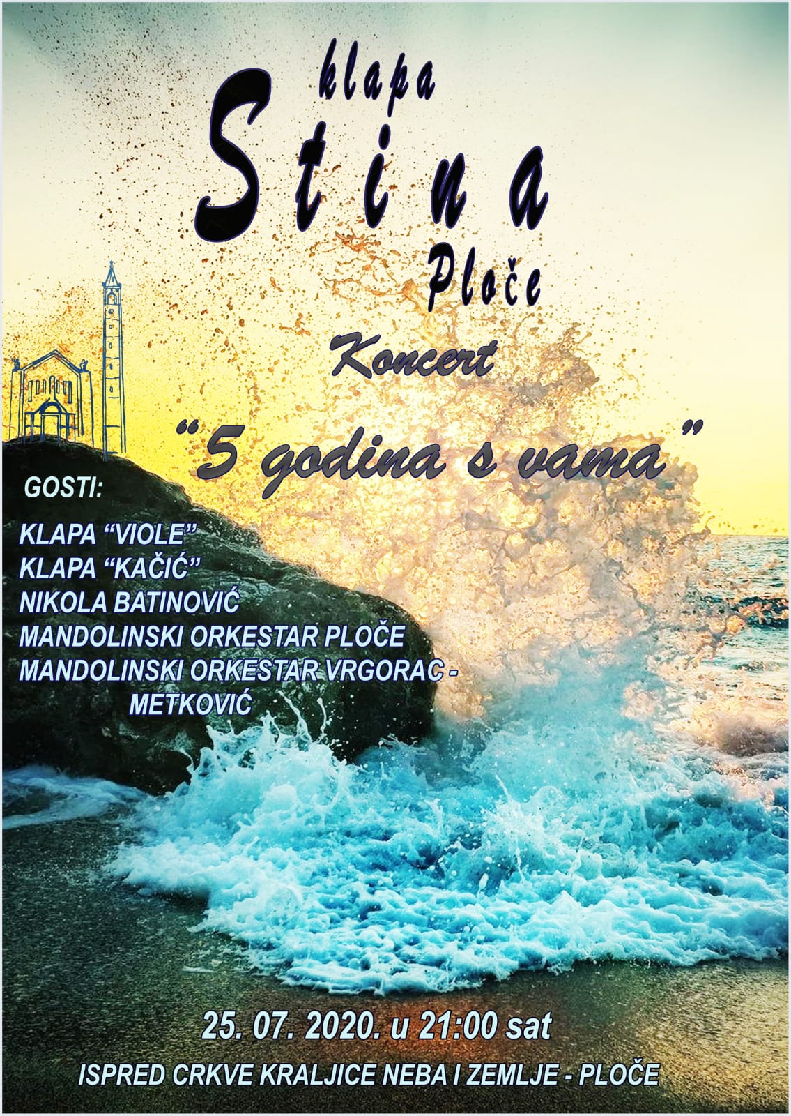 Klapa Stina iz Ploča slavi pet godina djelovanja i tim povodom organiziraju koncert “5 godina s vama” za svoje sugrađane koji će se održati 25.07. (subota) ispred crkve Kraljice Neba i Zemlje u Pločama.