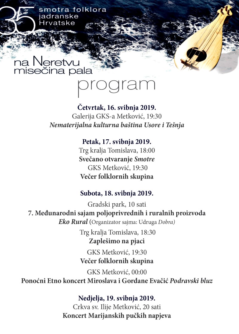 U Metkoviću od 16. do 19 svibnja 2019. održat će se 35. smotra folklora jadranske Hrvatske pod nazivom Na Neretvu misečina pala.