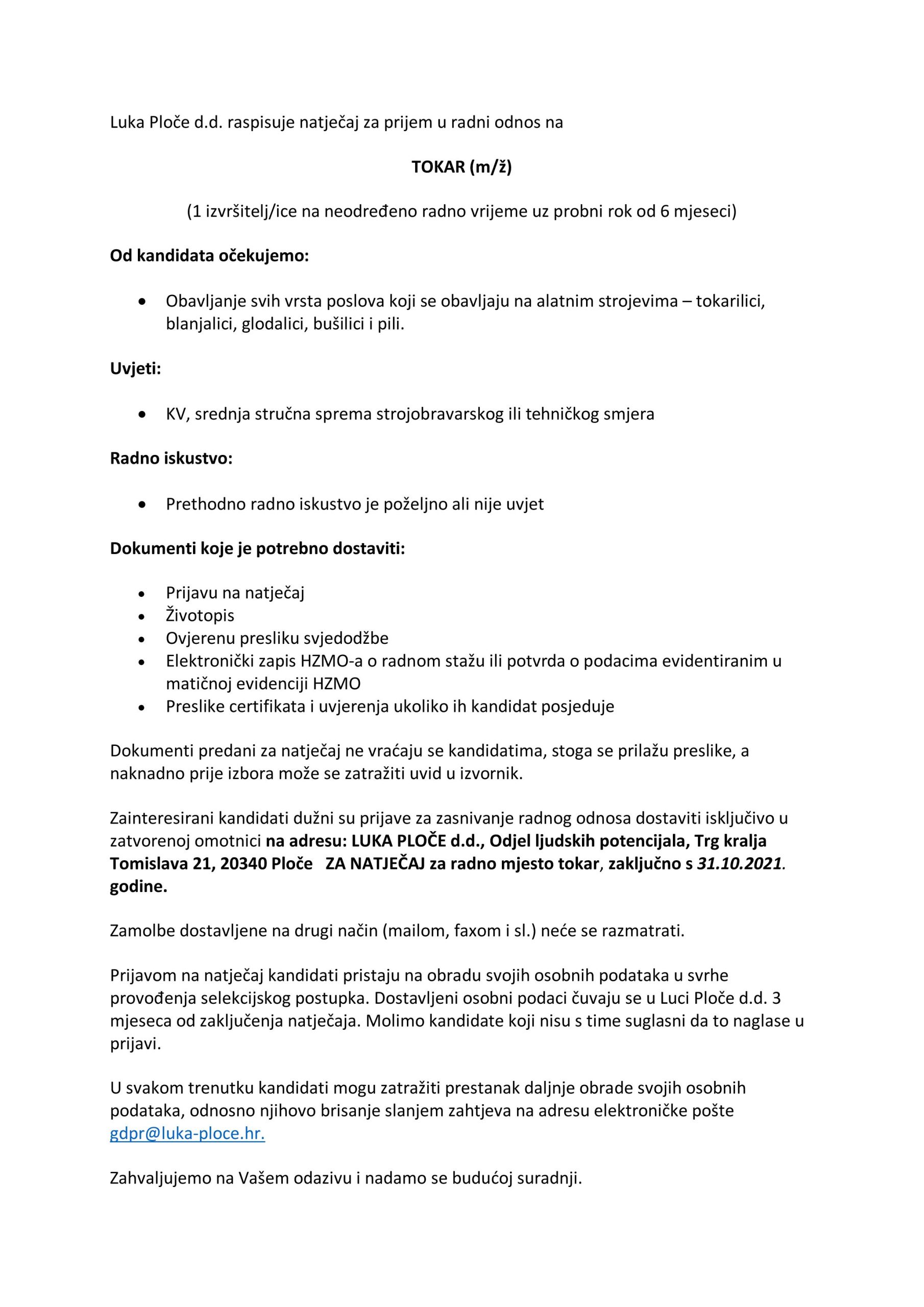 Luka Ploče Luka Ploče d.d. raspisuje natječaj za radno mjesto TOKAR na neodređeno vrijeme 25. listopada 2021. 0 Comments 300 Views Više na https://www.luka-ploce.hr/o-luci/zaposlenici/natjecaji/