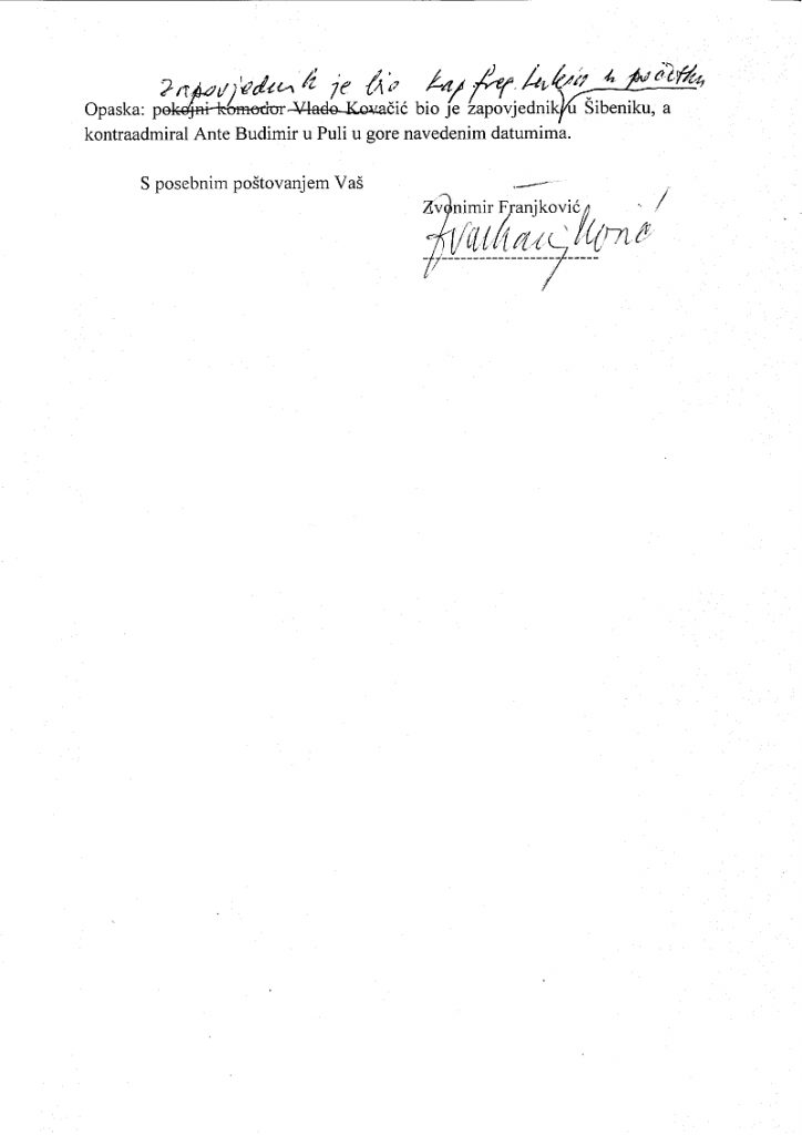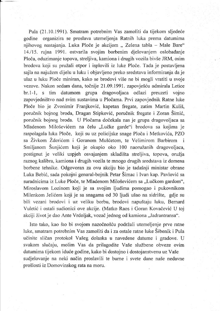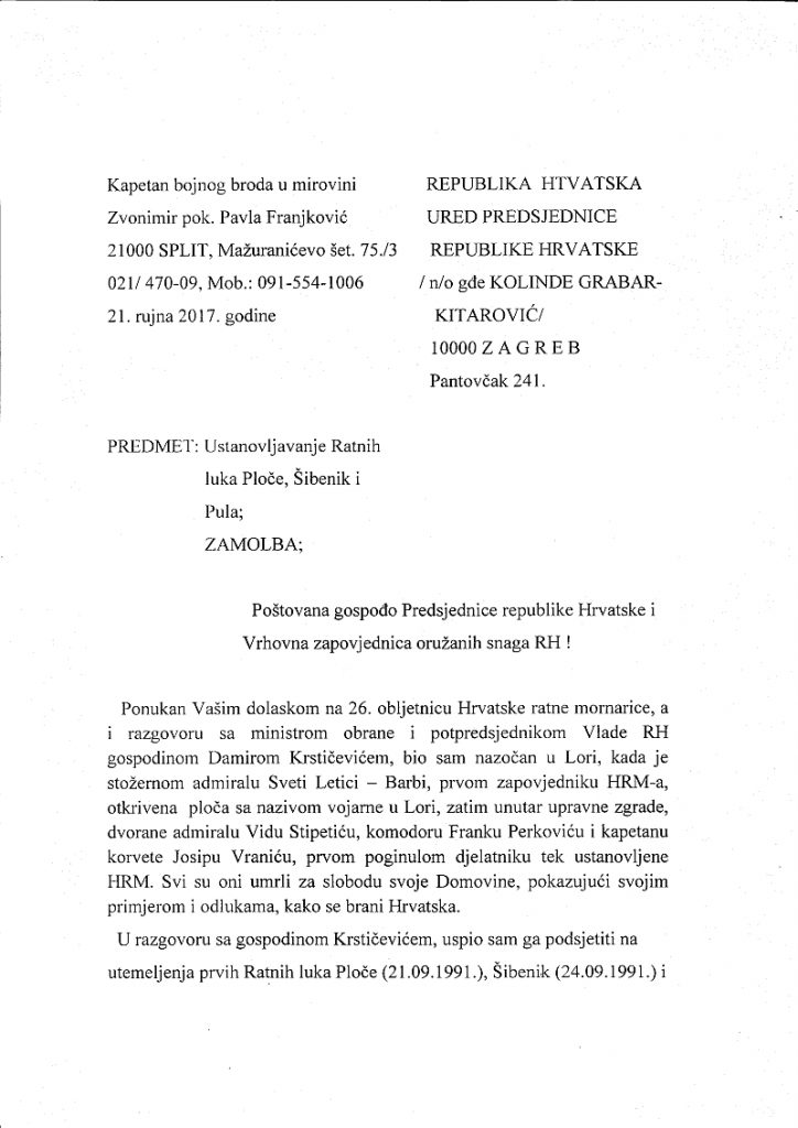 U prilogu donosimo Zamolbu koju je uputio Zvonimir Franjković Predsjednici republike Hrvatske i Vrhovnoj zapovjednici oružanih snaga RH, Kolindi Grabar – Kitarović, u kojoj se zamoljava da se tijekom sljedeće godine organizira proslava utemeljenja Ratnih luka prema datumima njihovog nastajanja i da svojom nazočnošću podrži utemeljenje prve ratne luke u Pločama.