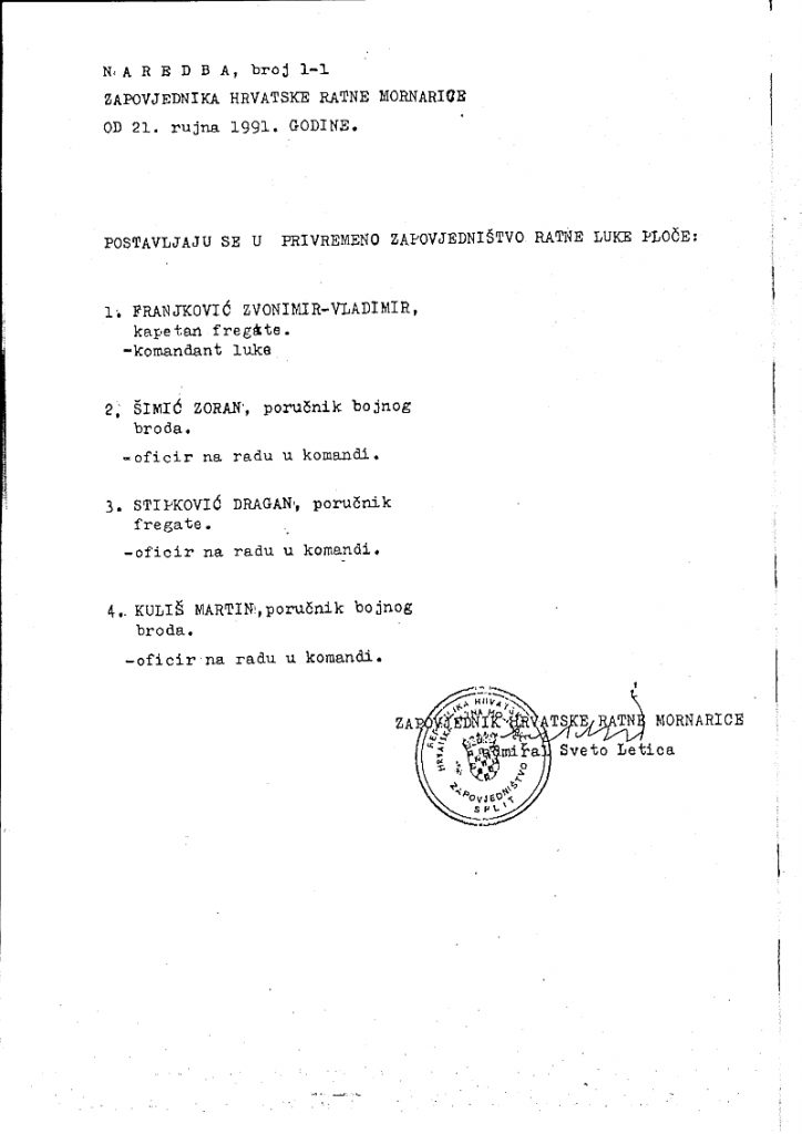 – Ratna luka Ploče utemeljena je nakon akcije „Zelena tabla-Mala Bara“ u kojoj je u Pločama osvojena prva neprijateljska vojarna u Domovinskome ratu. Zadatak je bio kontrola pomorskog prometa u južnom Jadranu, osiguranje infrastrukture u gradu i luci, osiguranje i raspodjela naoružanja, streljiva i vojne opreme koja je osvojena u vojarni, te pružanja pomoći u obrani Dubrovnika probijanjem pomorske blokade na području Ston-Šipan-Dubrovnik – rekao je Zvonimir Franjković, prvi zapovjedniki Ratne luke Ploče i kapetan fregate.