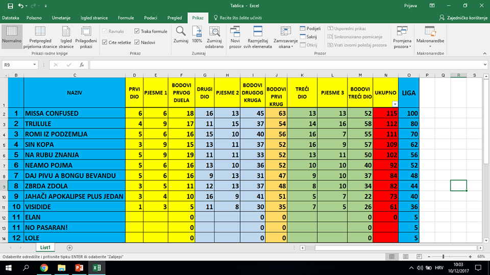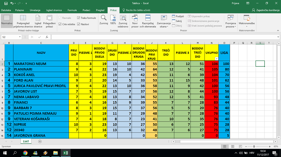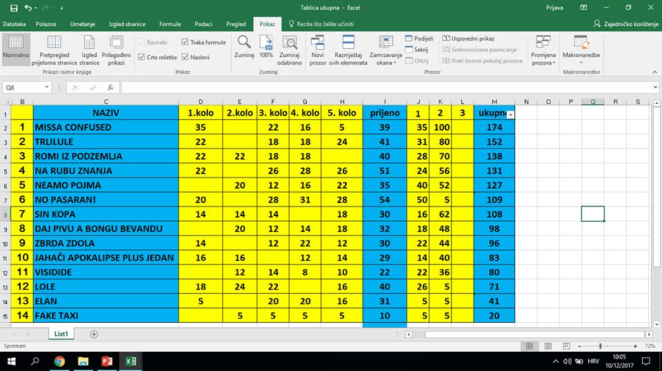 Tako uoči finalnog kola vode Planinari sa 225 bodova, ispred neumskih Maratonaca koji imaju 203 boda. Kokoš Anel je na visokom trećem mjestu sa 176, dok je Ford Alan četvrti sa 167 bodova. Obzirom da će u zadnjem kolu bodovi biti utrostručeni, još uvijek je sve moguće i garantira se pravi kvizaški spektakl u petak 15. prosinca (20 sati). Osim tjednih nagrada, pripremljene su i lijepe nagrade za konačan plasman u ligi.