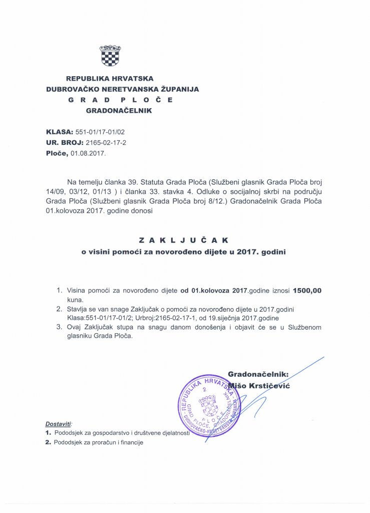 Gradonačelnik Ploča, Mišo Krstičević 01. kolovoza je donio ZAKLJUČAK o visini pomoći za novorođeno dijete u 2017. godini na temelju članka 39. Statuta Grada Ploča i članka 33. stavka 4. Odluke o socijalnoj skrbi na području Grada Ploča.