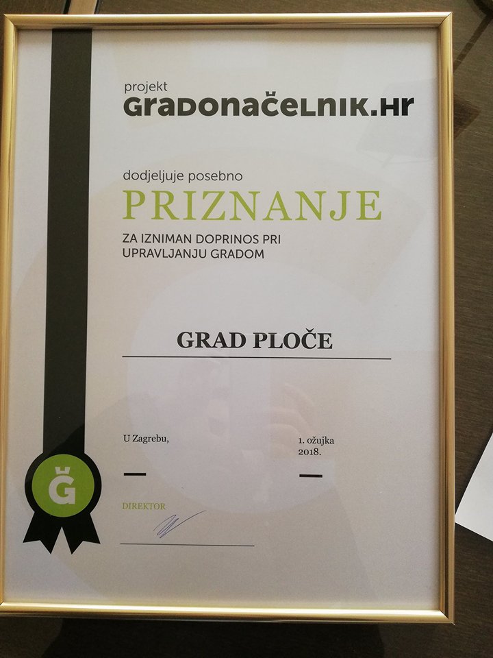 zbog iznimnih rezultata pri upravljanju Gradom Ploče šaljemo Vam službeno priznanje gradonacelnik.hr-a kojim želimo potaknuti podizanje standarda vođenja i upravljanja gradovima u Republici Hrvatskoj.