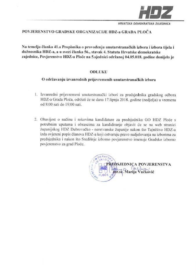 Izvanredni prijevremeni unutarstranački izbori za predsjednika/cu G. O. HDZ-a Ploče održat će se dana 17. lipnja 2018. godine u vremenu od 8:00 do 19:00 sati.