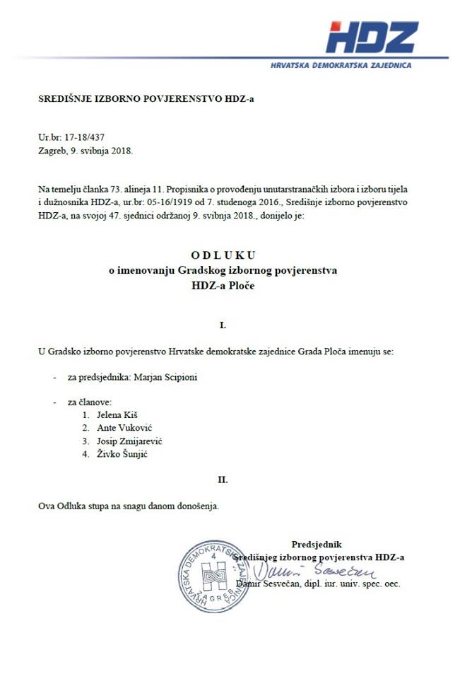 Središnje izborno povjerenstvo HDZ-a imenovalo je Gradsko izborno povjerenstvo HDZ-a Ploče u sastavu: Marjan Scipioni (predsjednik), Jelena Kiš, Ante Vuković, Josip Zmijarević i Živko Šunjić.
