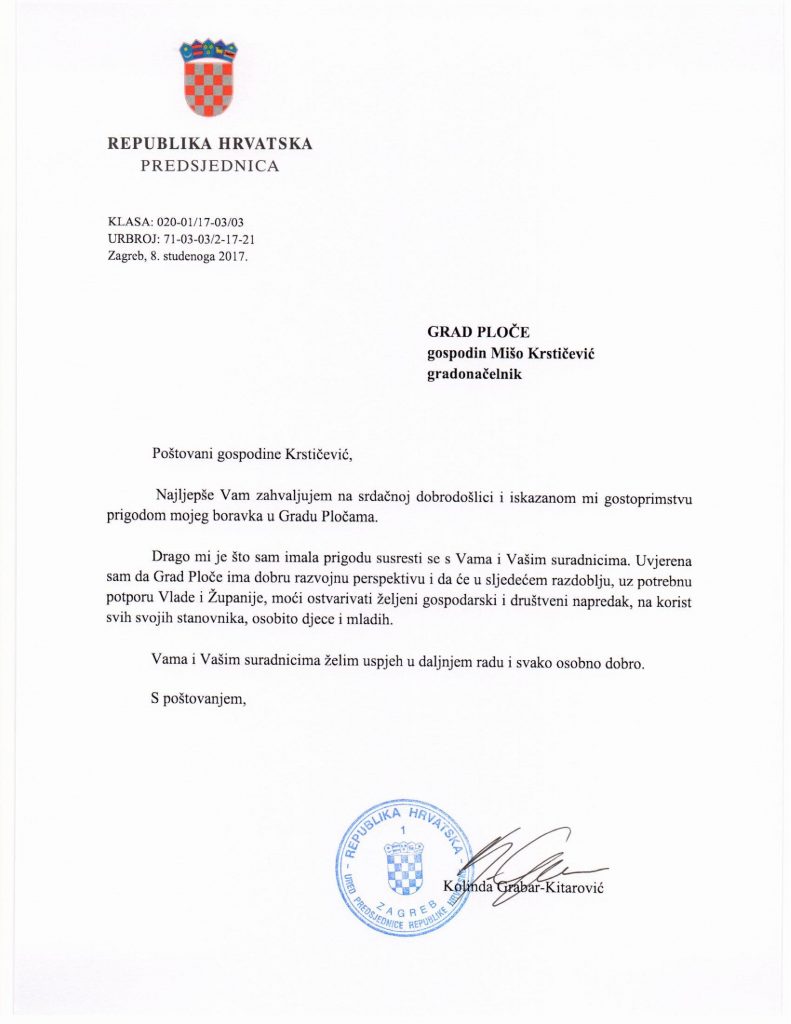 Sa službene stranice Grada Ploča prenosimo pismo zahvale koje je predsjednica RH uputila gradonačelniku Grada Ploča Miši Krstičeviću i njegovim suradnicima povodom nedavnog posjeta Predsjednice Pločama: