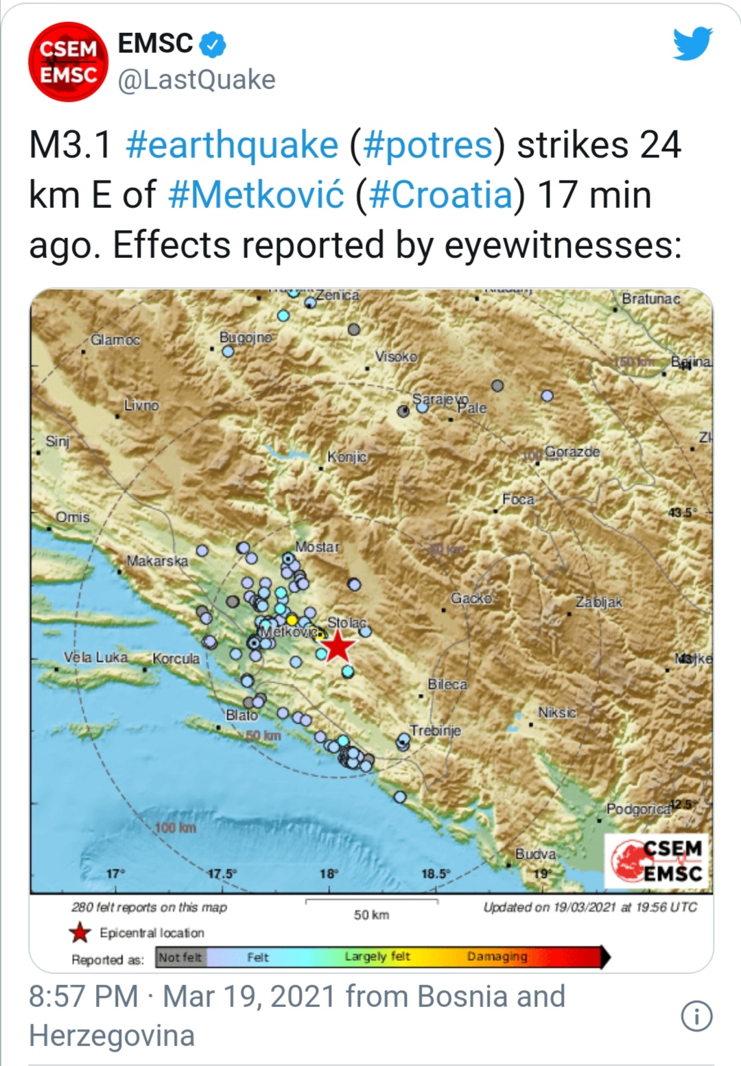 Oko 20.40 sati tlo se zatreslo 24 kilometra od Metkovića, točnije, 8 kilometra jugoistočno od Stoca u Bosni i Hercegovini.
