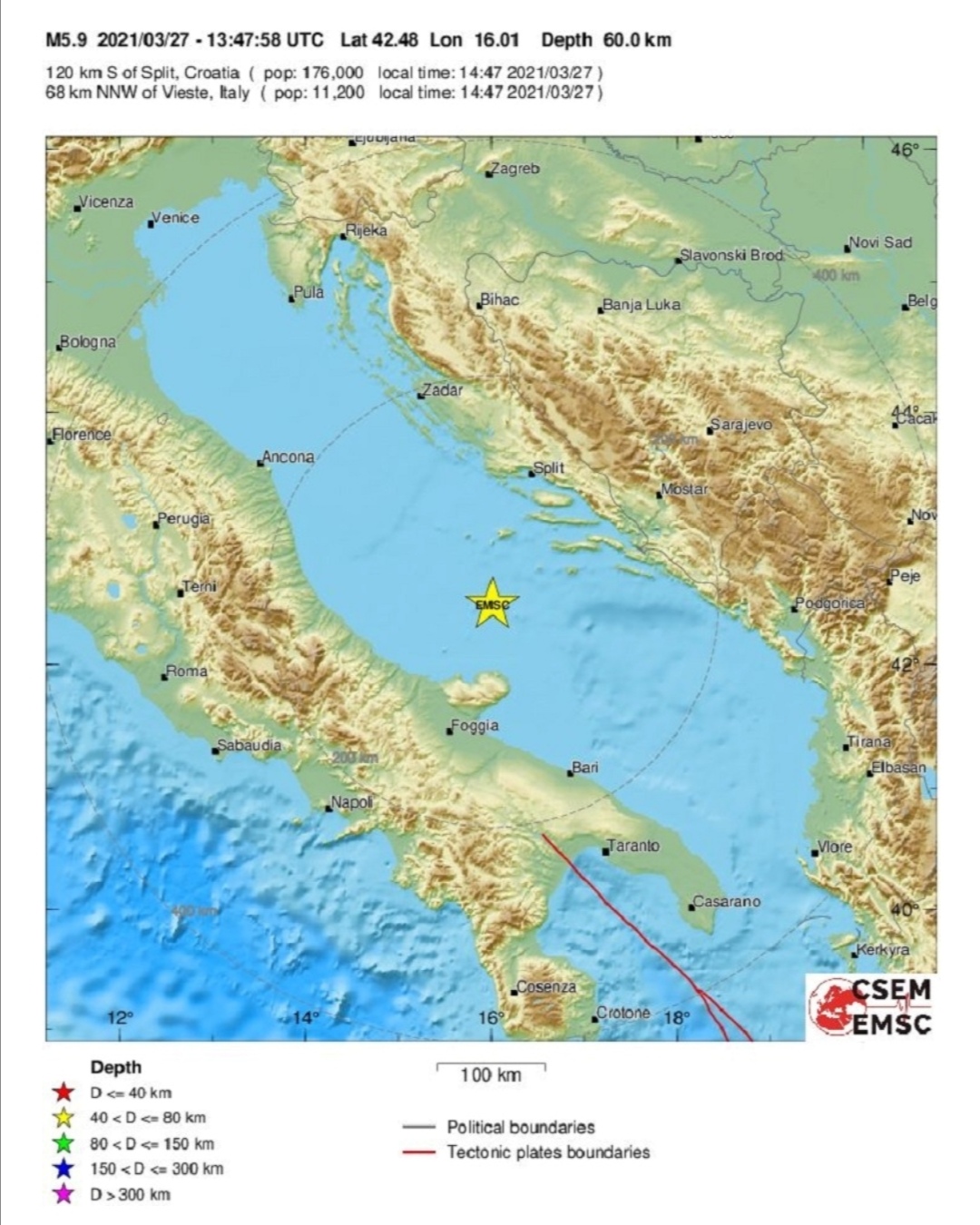 Epicentar je bio 169 kilometara sjeverozapadno od Barija. I, kako navodi EMSC, 120 kilometara južno od Splita.
