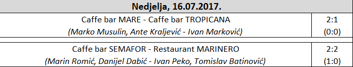 Nakon njih na teren su izašle ekipe Restorana Marinero i Caffe bara Semafor. Još jedna vrhunska predstava sa odličnim akterima, vrhunskim potezima i maksimalnom neizvješnošću do samog kraja. Dobro poznata ekipa Semafora očekivano je preuzela inicijativu na početku susreta što je bilo i očekivano s obzirom na sastav (Primorac, Dabić, Romić, Mušan..) i imala 2 gola prednosti.