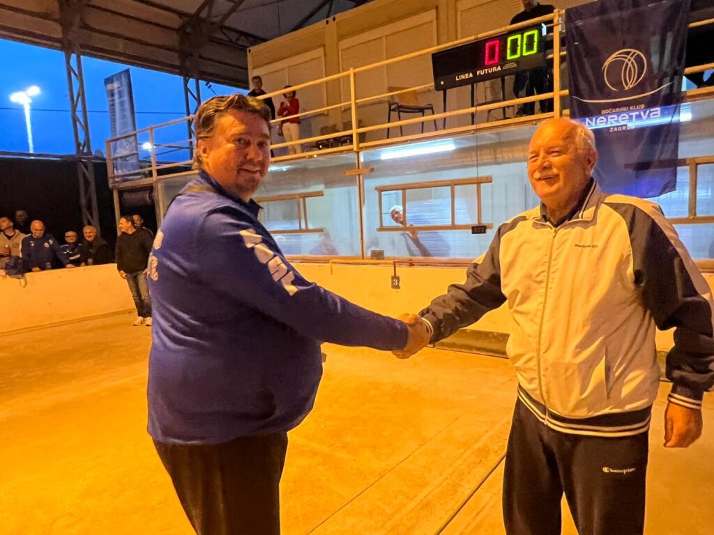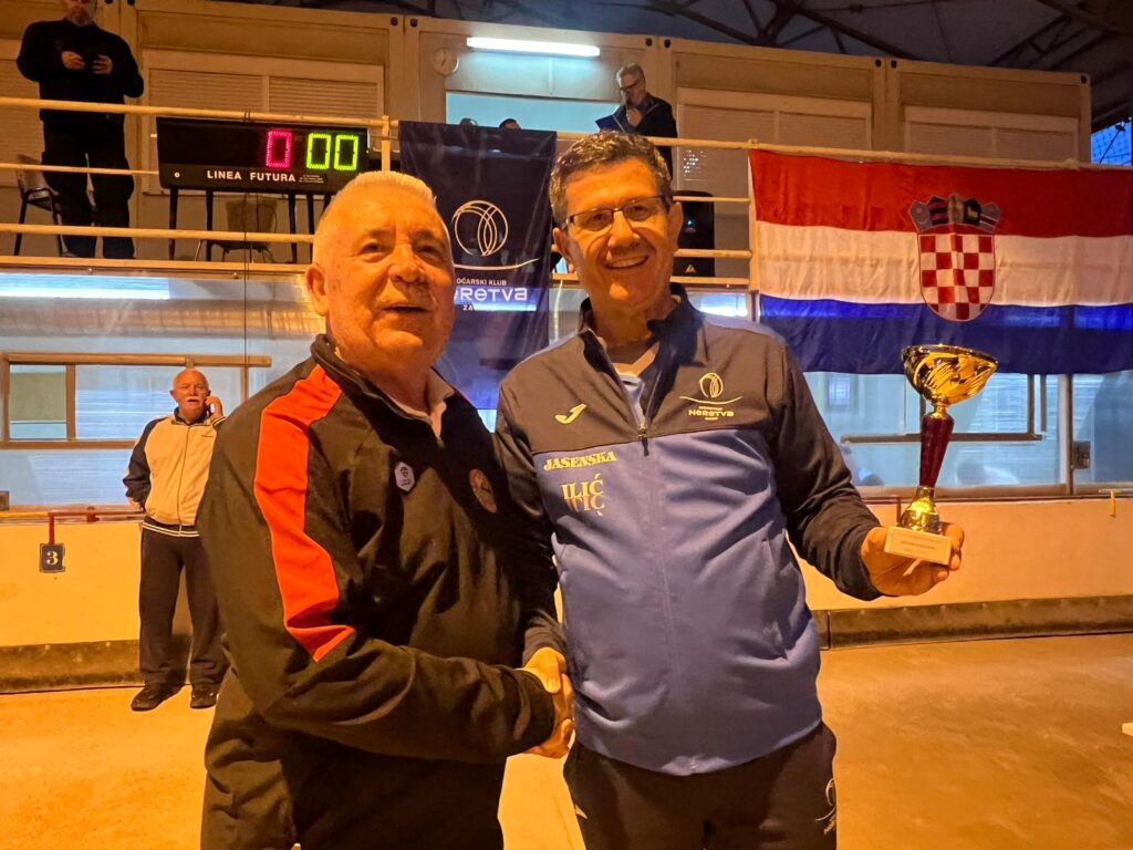 Milan Vugdelija, pobjednik u izbijanju bulina. Pehar mu je predao Mario Talajić iz BK Neretva.