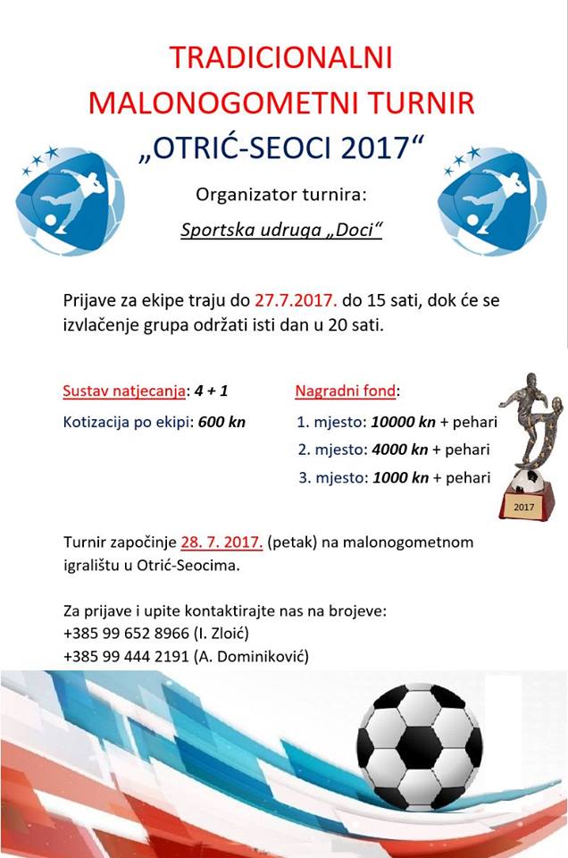 Ekipe se mogu prijaviti svakim danom do 27.07.2017. do 15 sati. Za prijave i ostale informacije obratite se na brojeve telefona navedene na slici ili putem naše facebook stranice – LINK. Izvlačenje se obavlja 27.07.2017 u Sportskom centru “Doci” u Otrić-Seocima u 20 sati.