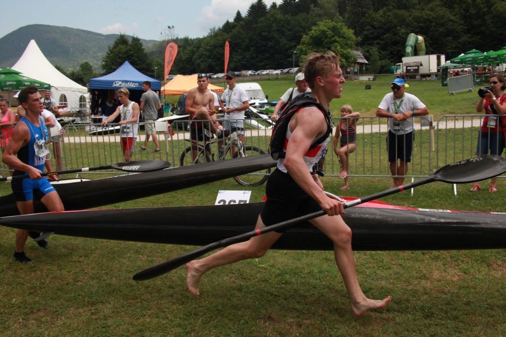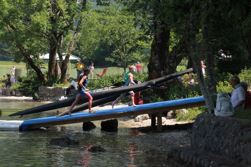 Tu športaši izlaze i trčeći prenose čamce do rampe za spuštanje čamaca ispod mosta, gdje će biti postavljeni ulazni pontoni, preko kojih športaši ulaze u čamac, veslaju uzvodno gdje je označeno drugo okretište oko bova, te nastavljaju dalje vožnju nizvodno do donjeg okretišta. Broj krugova koje moraju športaši napraviti, kao i broj prenošenja čamaca (portaž) određen je pravilima natjecanja za svaku kategoriju.