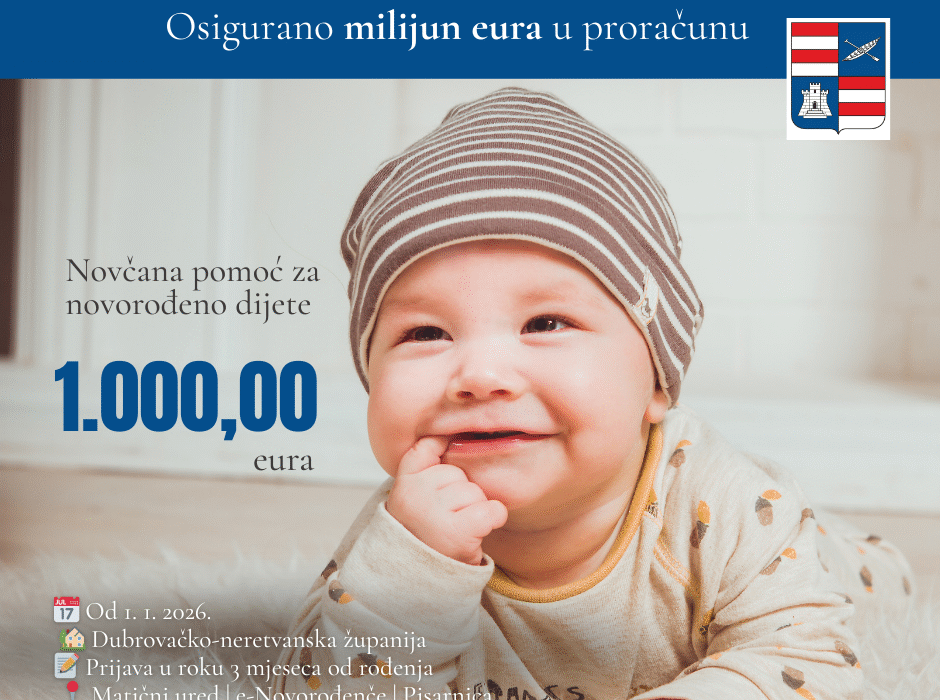 Čak milijun eura u novom proračunu Dubrovačko-neretvanske županije osigurano je za ovu mjeru, koja se odnosi na sve bebe rođene od 1.1. 2026. godine, a čije obitelji pravovremeno podnesu zahtjev i ispunjavaju pripisane uvjete.